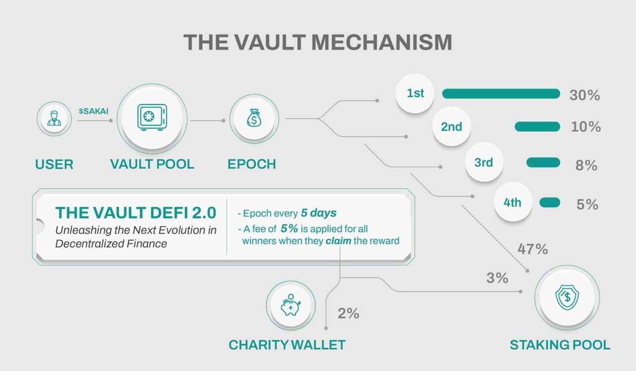Sakai Vault introduces an innovative epoch system that offers exciting rewards. Users committing a minimum of $10 worth of $SAKAI tokens become eligible for The Vault. No forms or additional payments are required, as the smart contract automatically enrolls eligible participants.